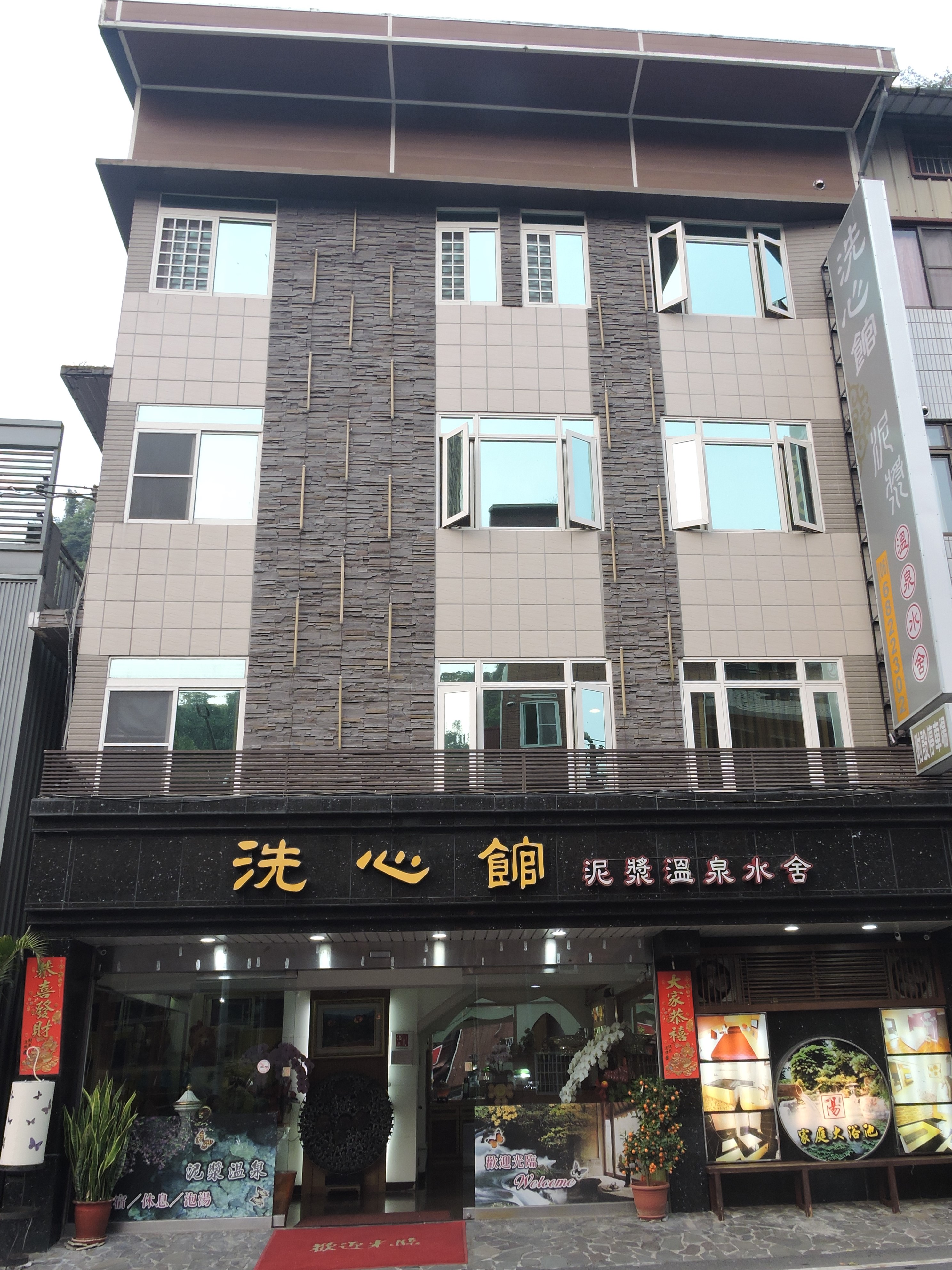 關子嶺溫泉-洗心館溫泉泥漿水舍。是關子嶺溫泉區之百年溫泉老店之一,1913年間發行的關子嶺溫泉繪葉書裡就已記載了,早期為日式檜木建築,可惜經歷民國53年白河大地震損毀,重建後,經歷幾次整修,才是大家看到的面貌,將來計畫以復刻整修方式找回當年的日式風味!